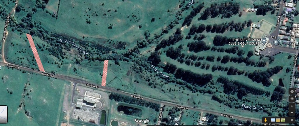 Braidwood Common extends from Boppins Crossing Rd. (at left) to Garvey St. (at right) and straddles Gillamatong and Flood Creek beside the Golf Course. The pink shaded bands represent the proposed Green Wedge plantings. Bombay Rd. is at the bottom of the image.